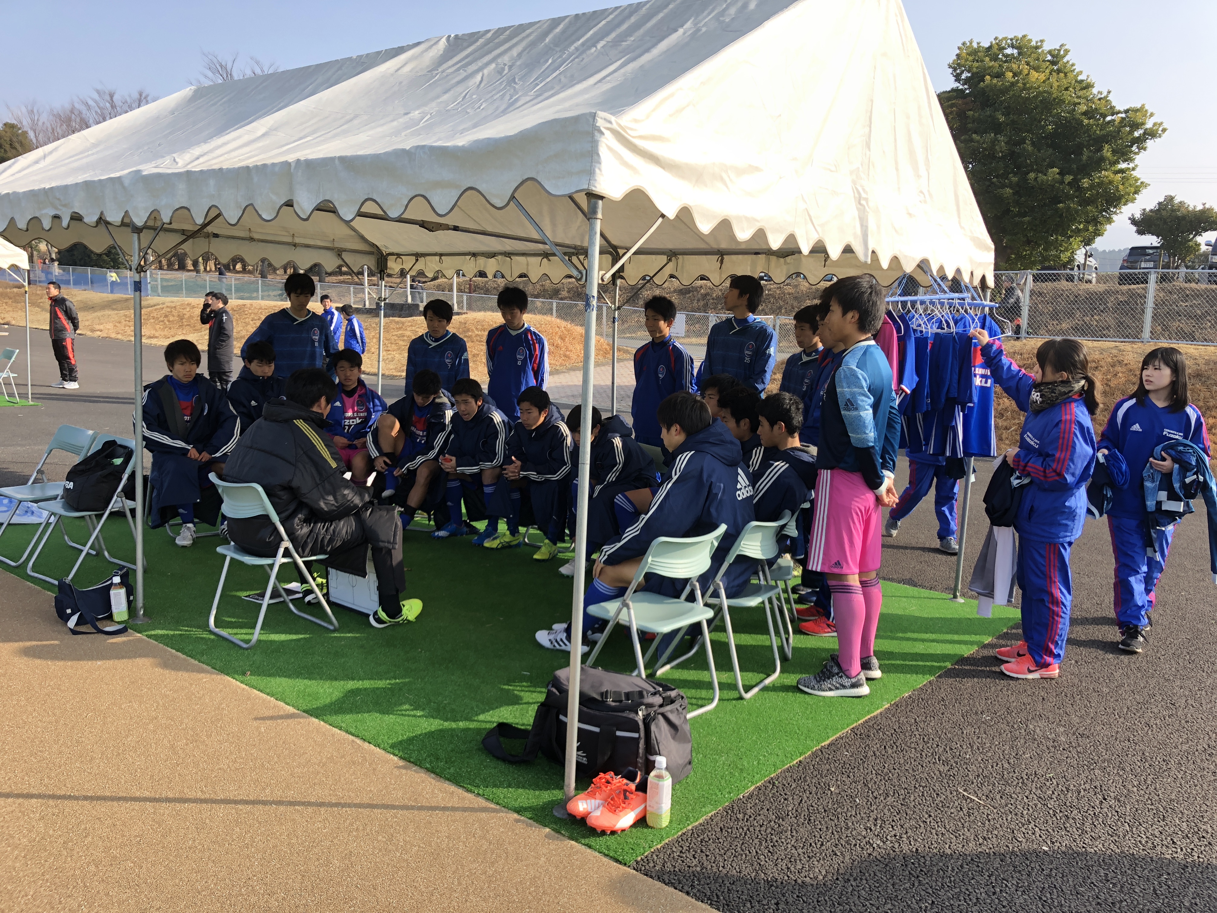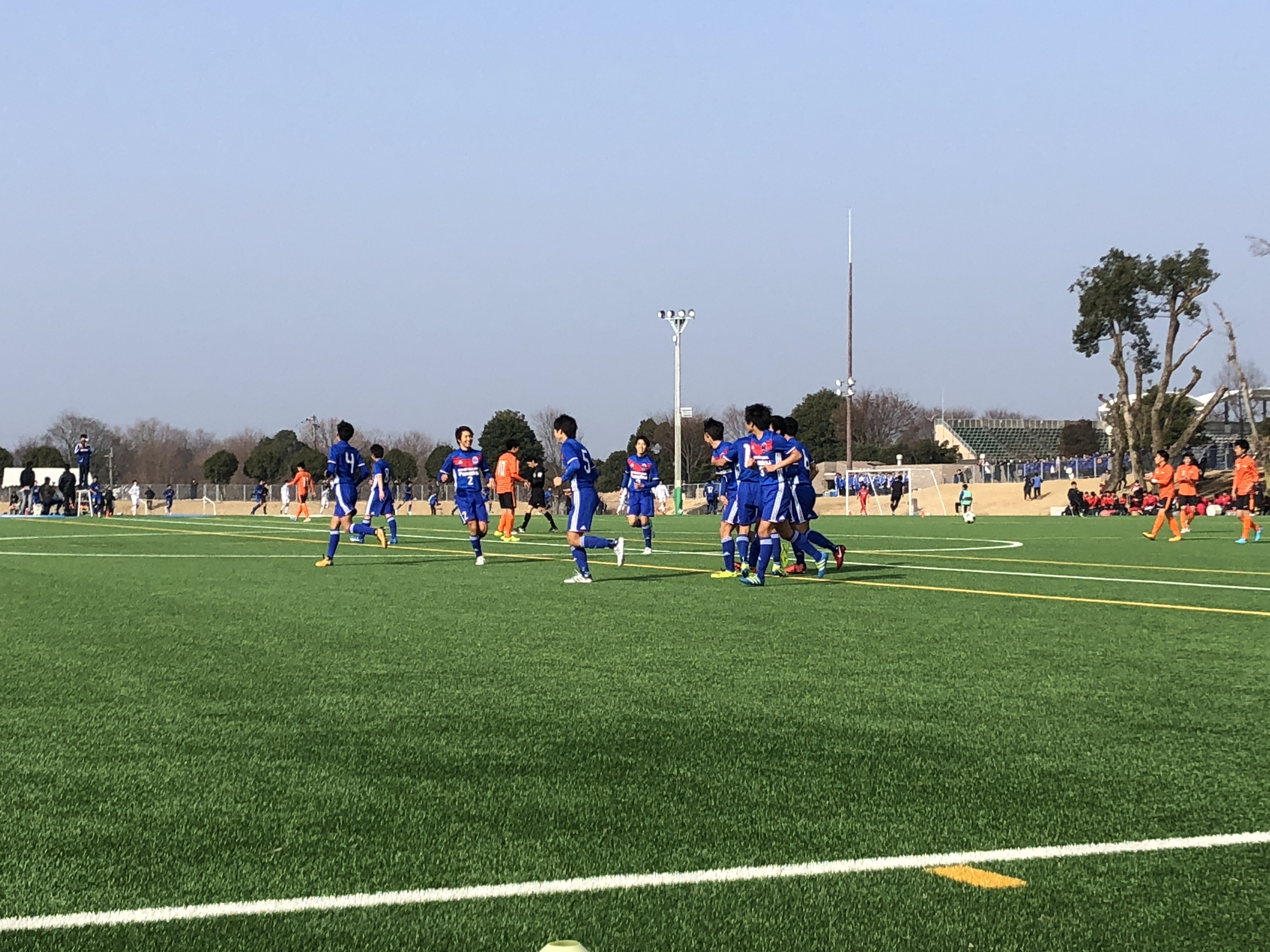 ・立ち上がりの半1分、けんしんのCKがアウト回転でそのままゴールし幸先よく先制点を奪います。リズムに乗った学付は半10分にハーフライン付近からGKの位置を確認したタイセイがロングシュート!これが見事にゴールに突き刺さり追加点。前半はCBのタクトが厳しいチェックからインターセプトを早くも3本決め、こうせいもヘディングで負けないので、DFがとても安定していました。前半19分、再三いい仕掛けをしていたふみひろが綺麗に裏に抜け出しGKと一対一になりますが、惜しくもシュートは外れます。その際に相手GKと接触し無念の負傷交代。いいプレーをしただけに残念です。中盤の運動量が光るヒビキとケンシンがリズムを作り、前半32分には途中出場のカンタが抜け出してシュートまでいきますが、ここは枠の外。DF陣が最後は相手の攻撃を凌ぎ、前半は2-0で折り返します。